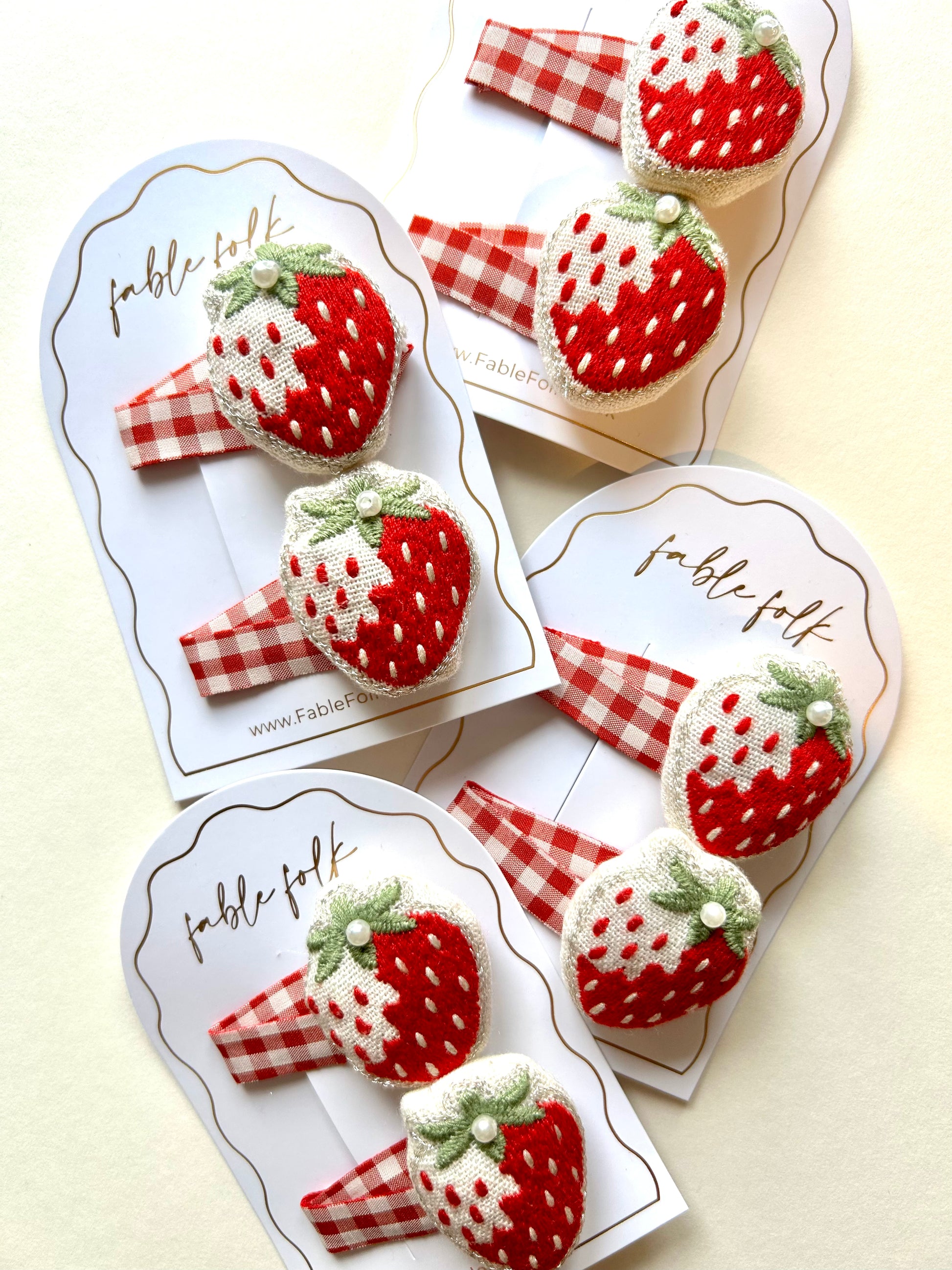 Embroidered Strawberry Gingham Snap Clips (2pk)